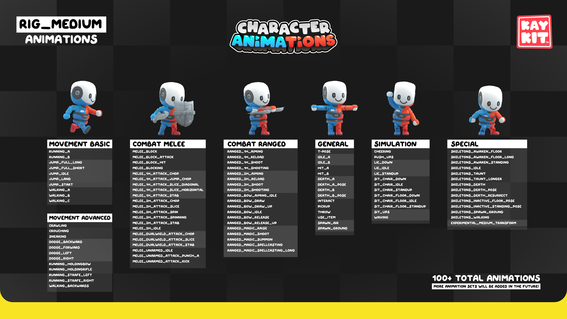 The animations come in 'animation sets' sorted by category, so you can pick and choose which types of animations you need for your project. The animations are split up per rig type, currently Rig_Medium and Rig_Large for use with regular and large KayKit characters.