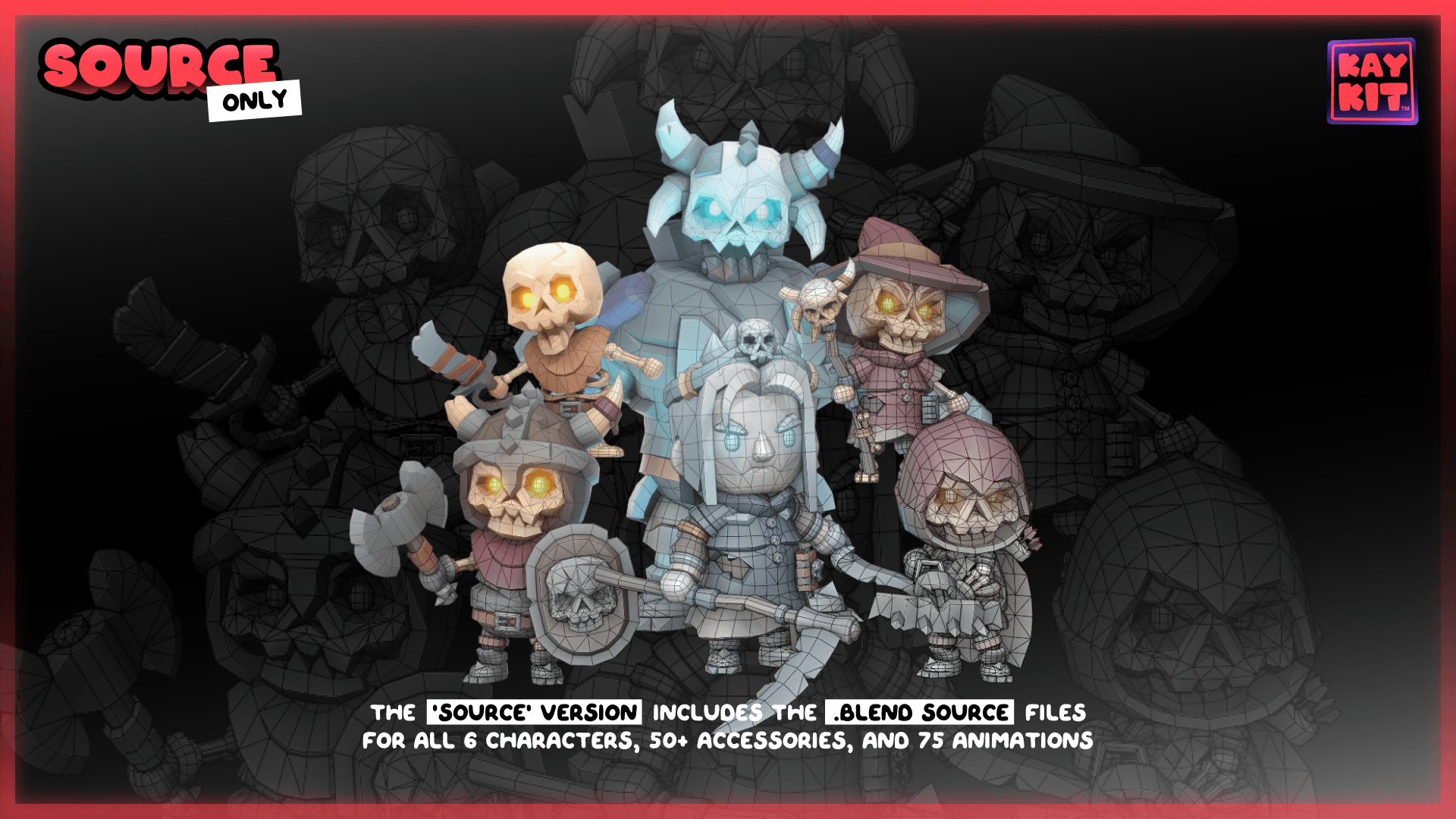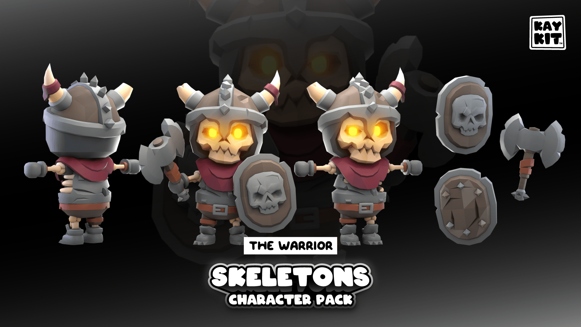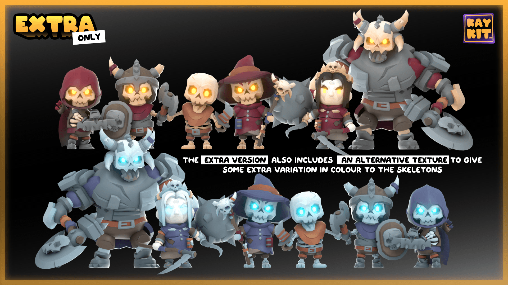 The Skeletons Character Pack is a bundle of characters assets that contain 4 (+2 in the EXTRA tier) stylised low-poly skeleton character assets. The skeletons are fully rigged and animated and come with 90+ animations and 10+ accessories.