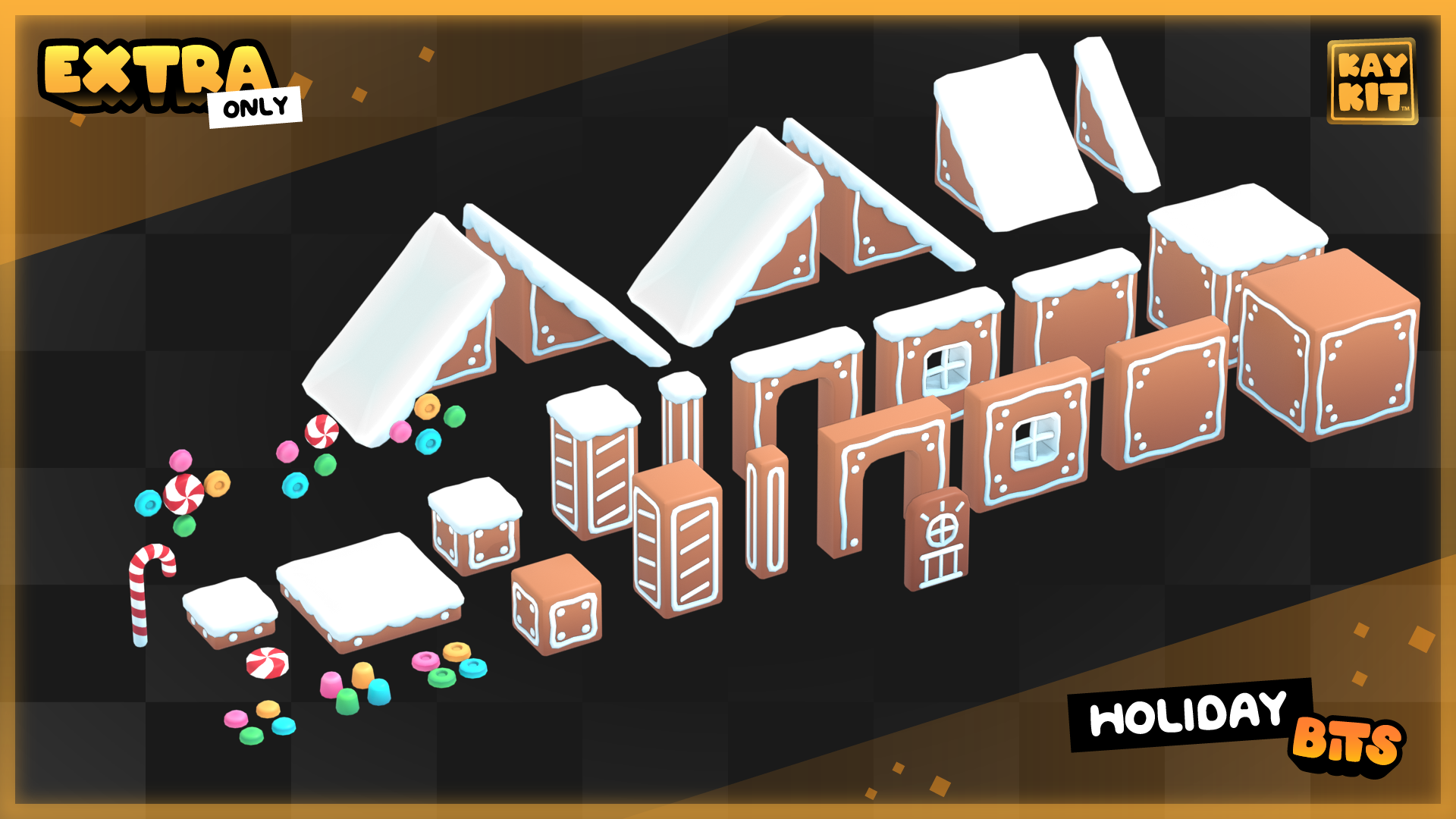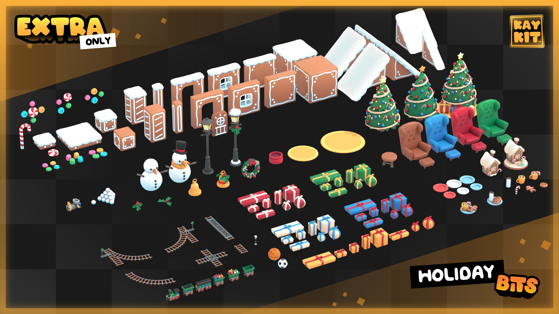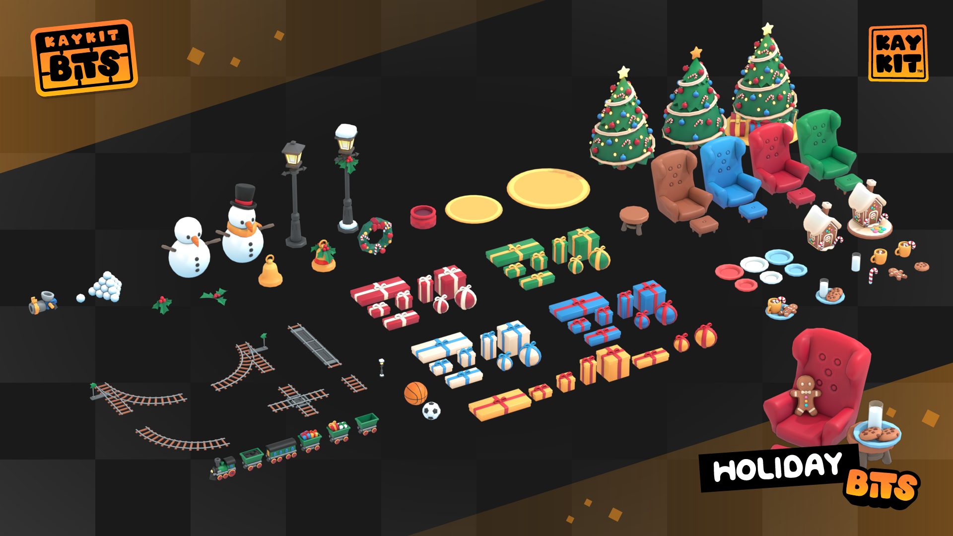 This pack has a bunch of holiday themed 3D models, great for adding some festive flair to your game, or make a small seasonal game. There's presents, a christmas tree, train and traintracks, festive cookies and snacks, snowman, snowballs, snowball cannon, modular gingerbread pieces, and much more!
