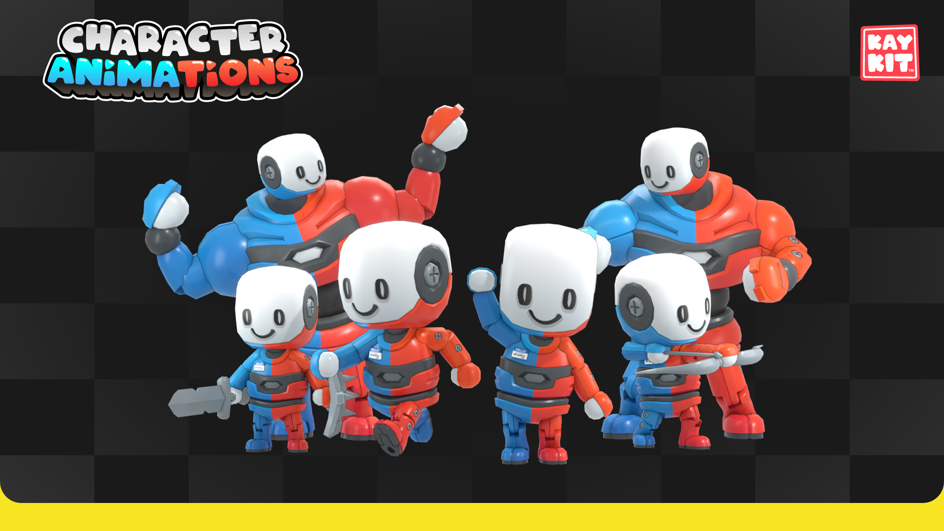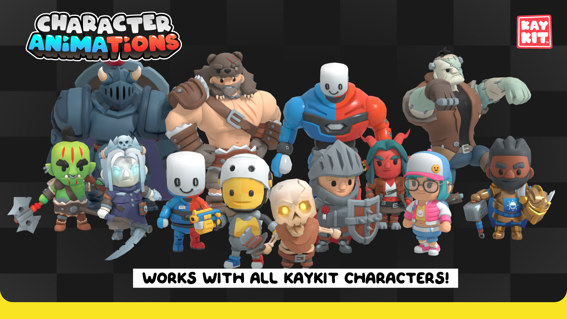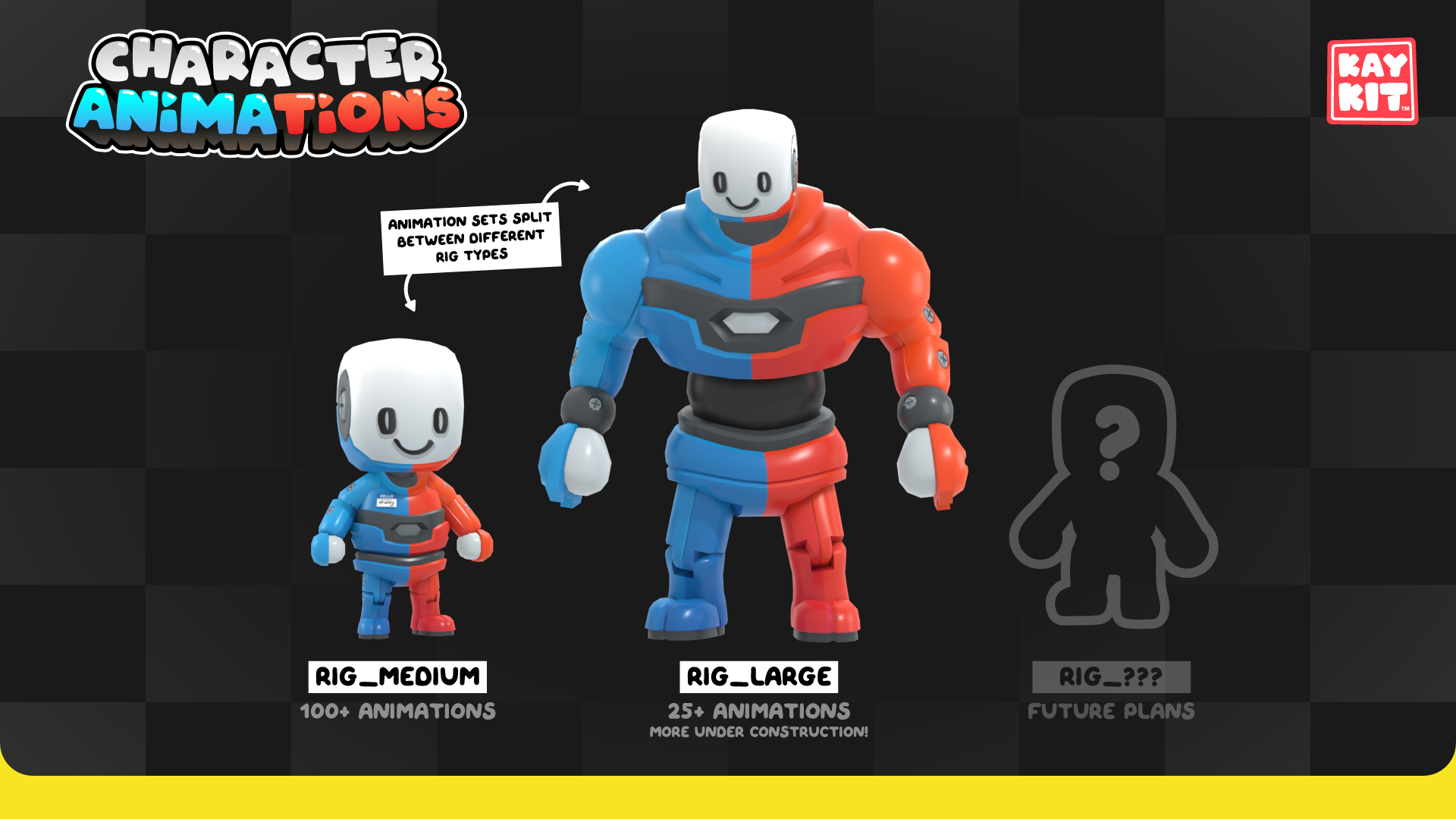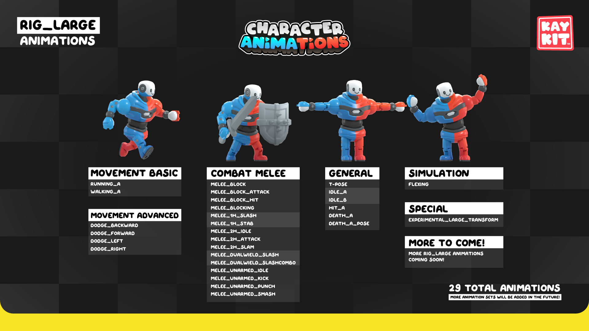 The animations come in 'animation sets' sorted by category, so you can pick and choose which types of animations you need for your project. The animations are split up per rig type, currently Rig_Medium and Rig_Large for use with regular and large KayKit characters.