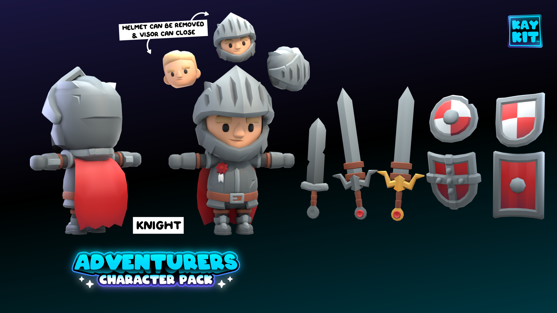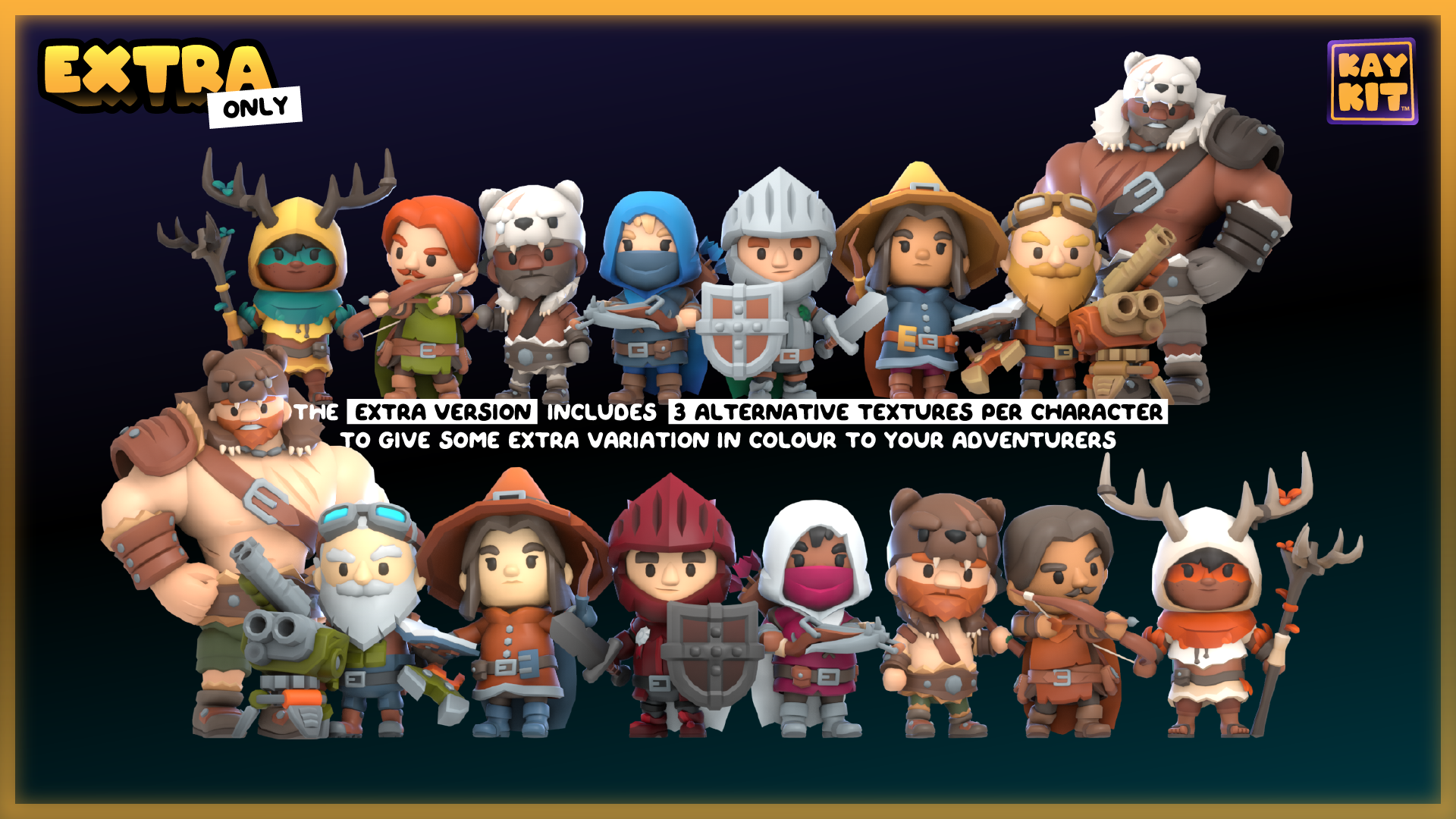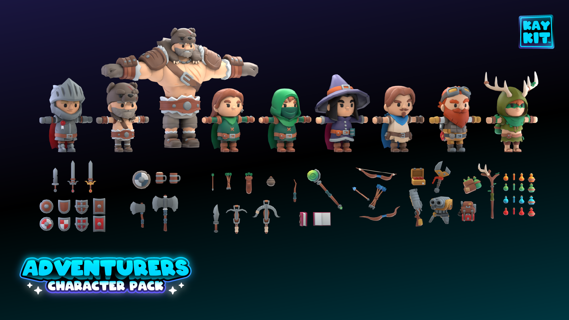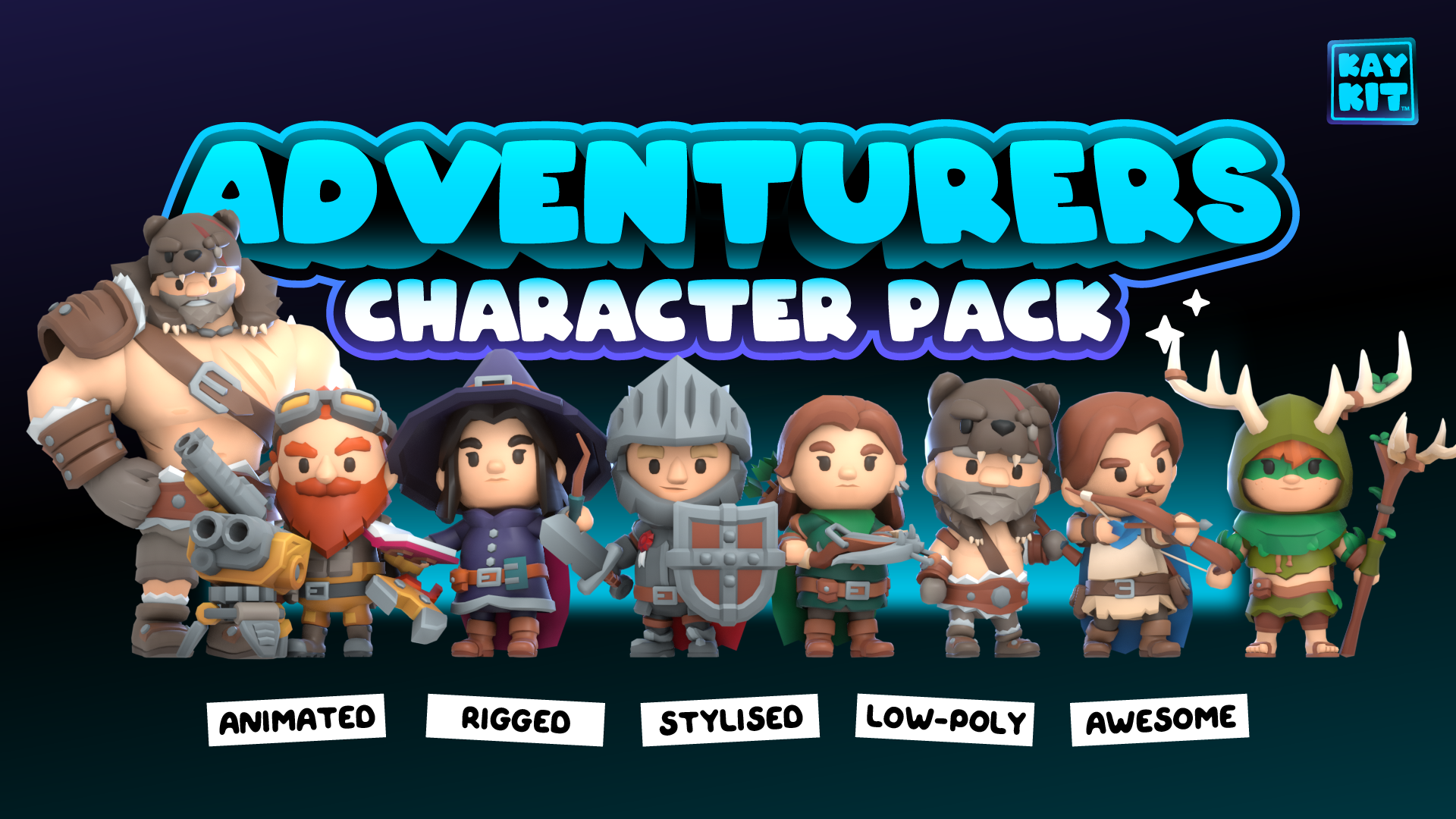 The Adventurers Character Pack is a bundle of characters assets that contain 5 (+3 in the EXTRA tier) stylised low-poly character assets. The characters are fully rigged and animated and come with 25+ accessories