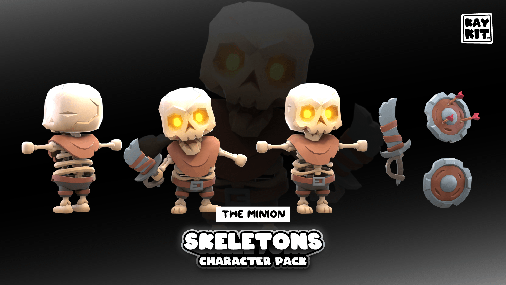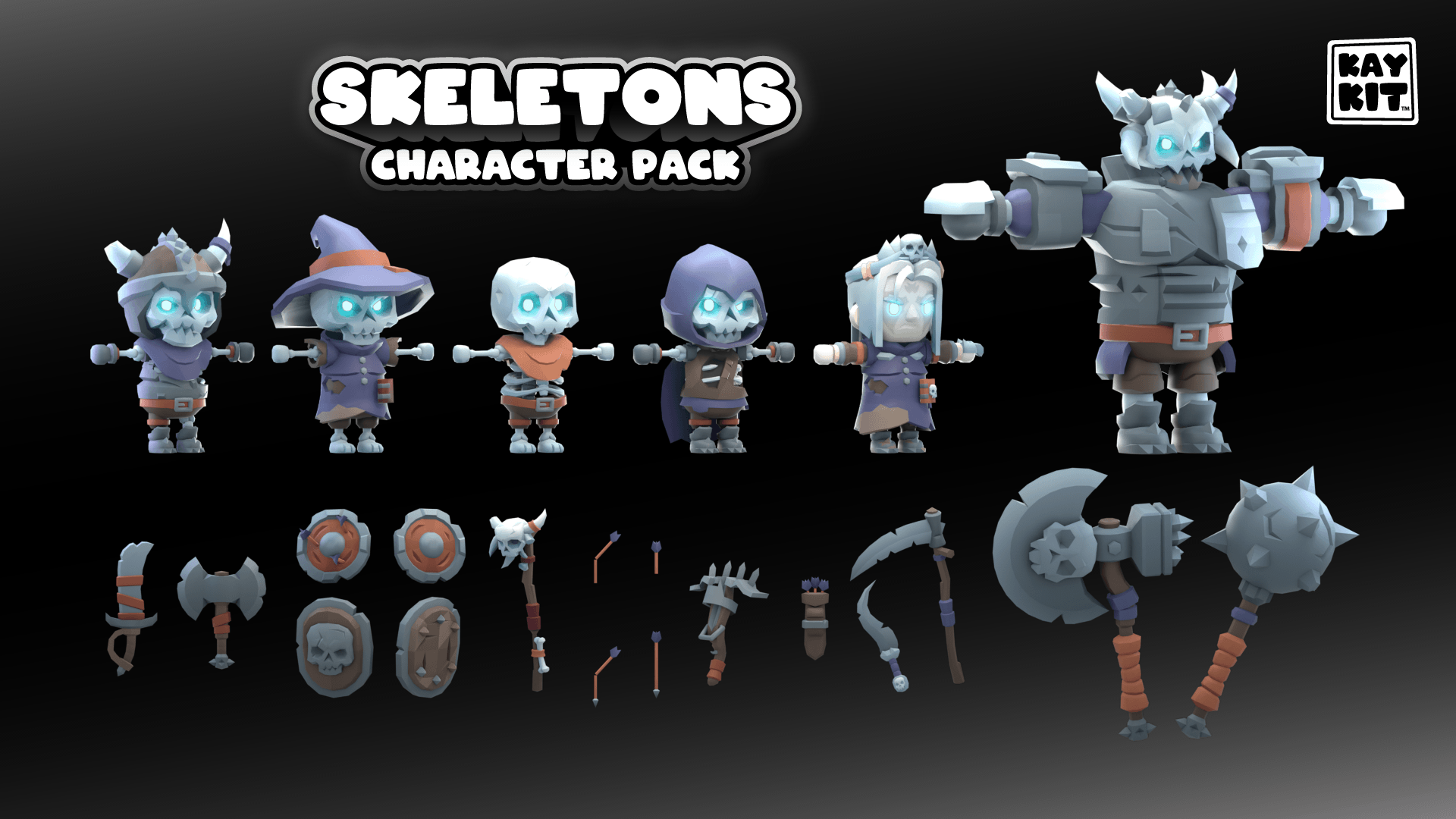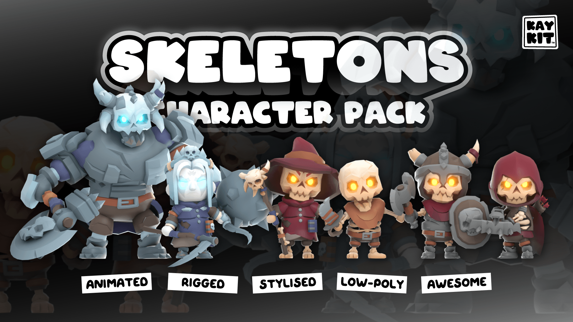 The Skeletons Character Pack is a bundle of characters assets that contain 4 (+2 in the EXTRA tier) stylised low-poly skeleton character assets. The skeletons are fully rigged and animated and come with 90+ animations and 10+ accessories.