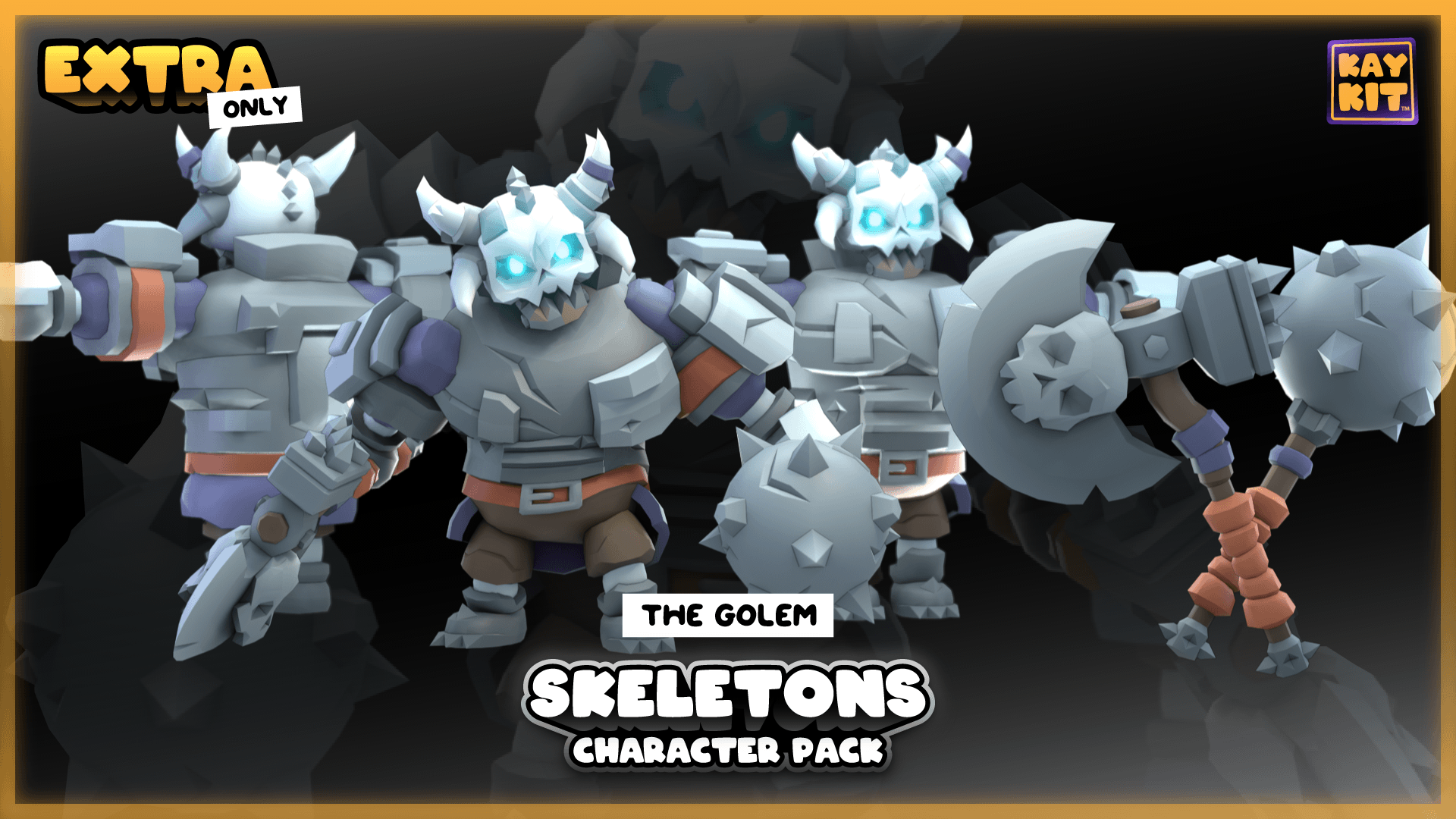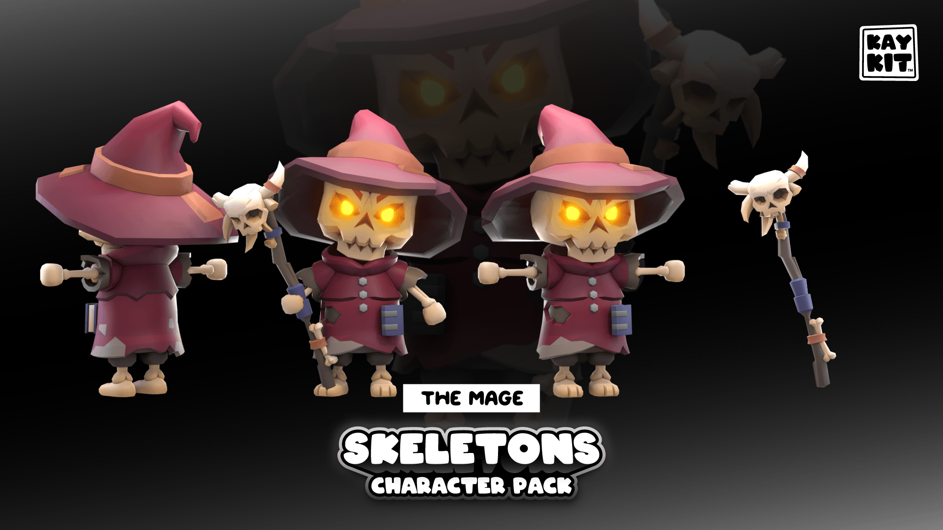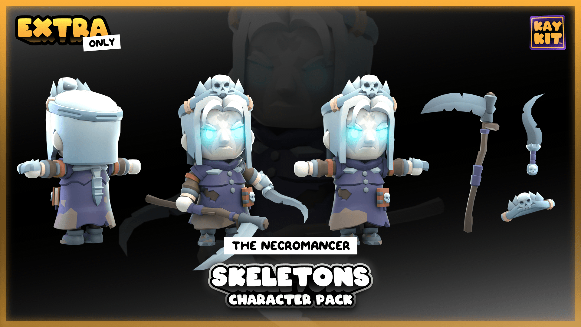 The Skeletons Character Pack is a bundle of characters assets that contain 4 (+2 in the EXTRA tier) stylised low-poly skeleton character assets. The skeletons are fully rigged and animated and come with 90+ animations and 10+ accessories.