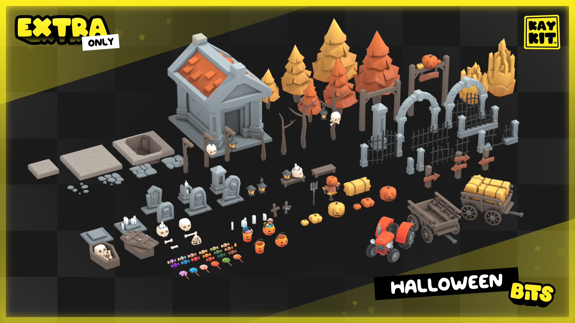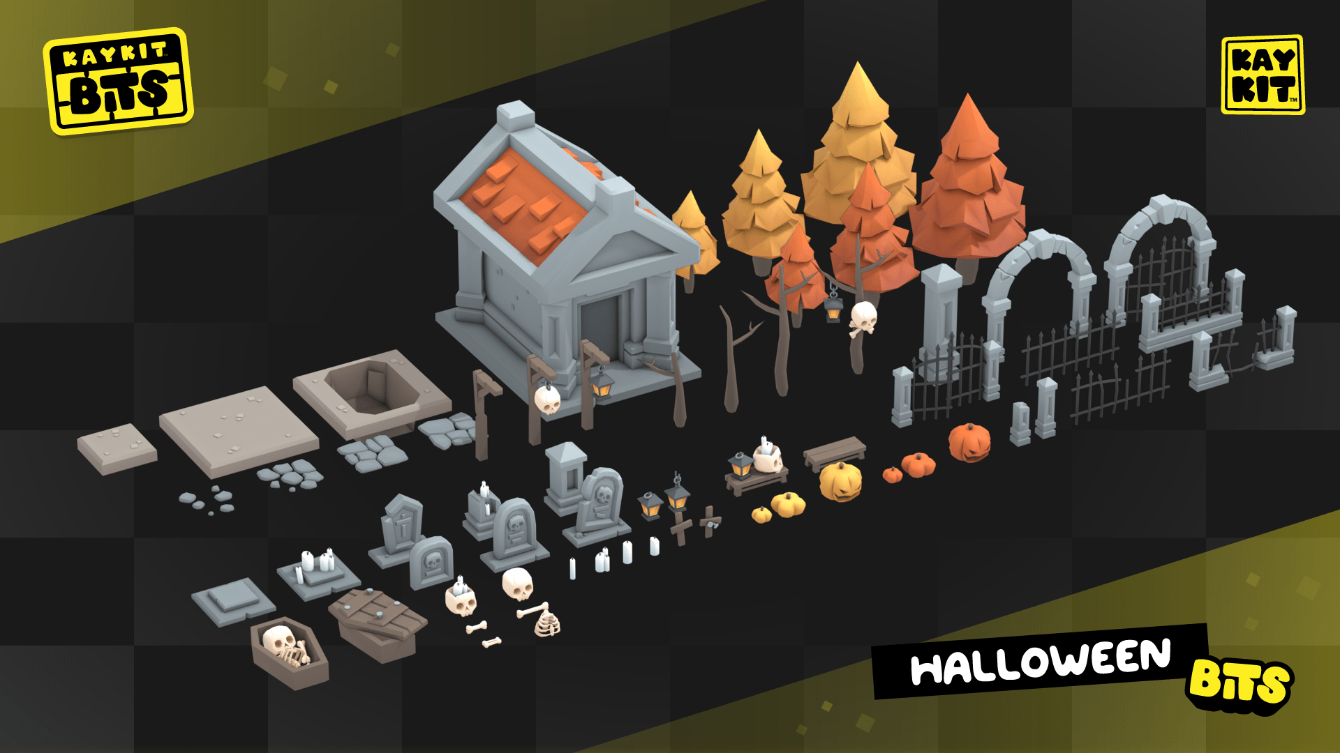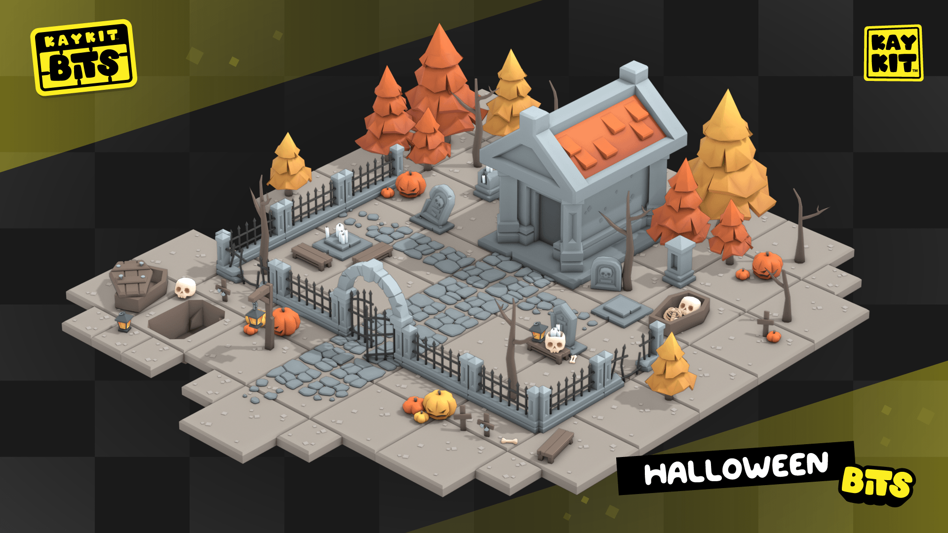 This pack has a bunch of halloween game assets for adding some spooky vibes to your game, like a creepy cemetery!