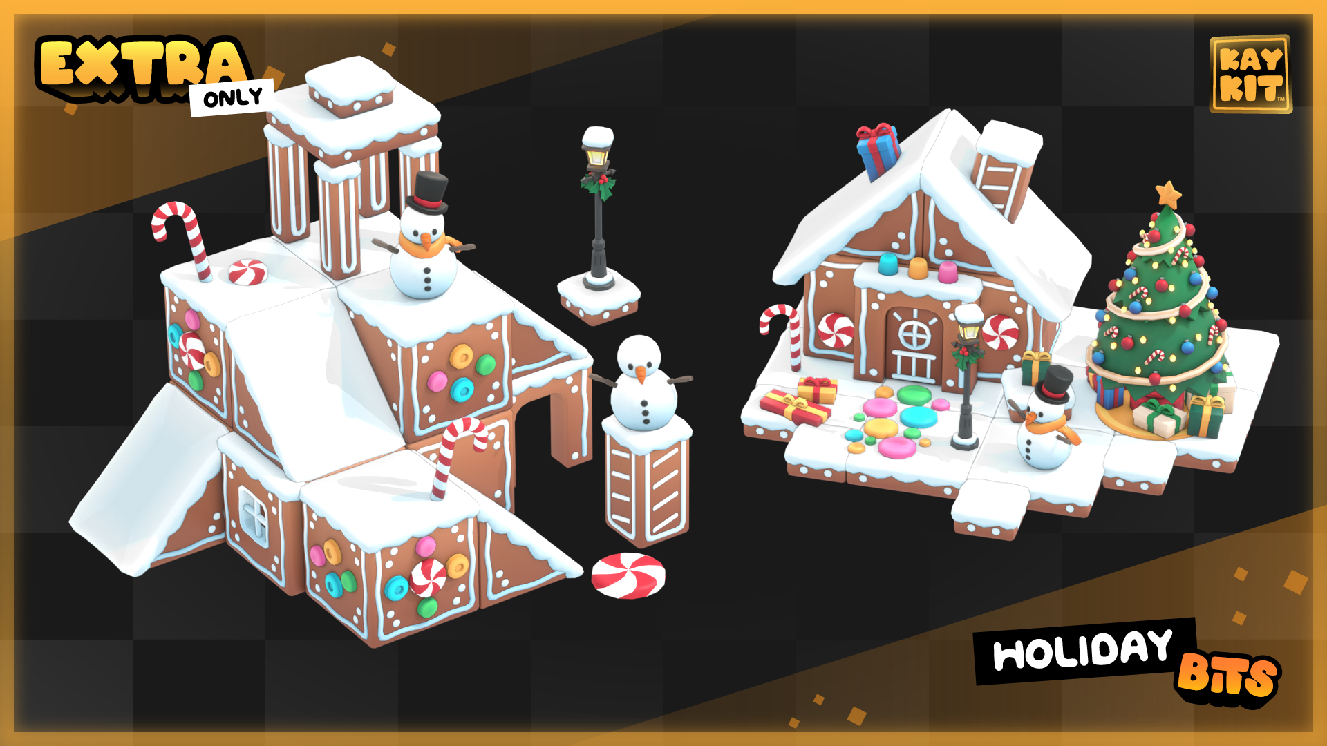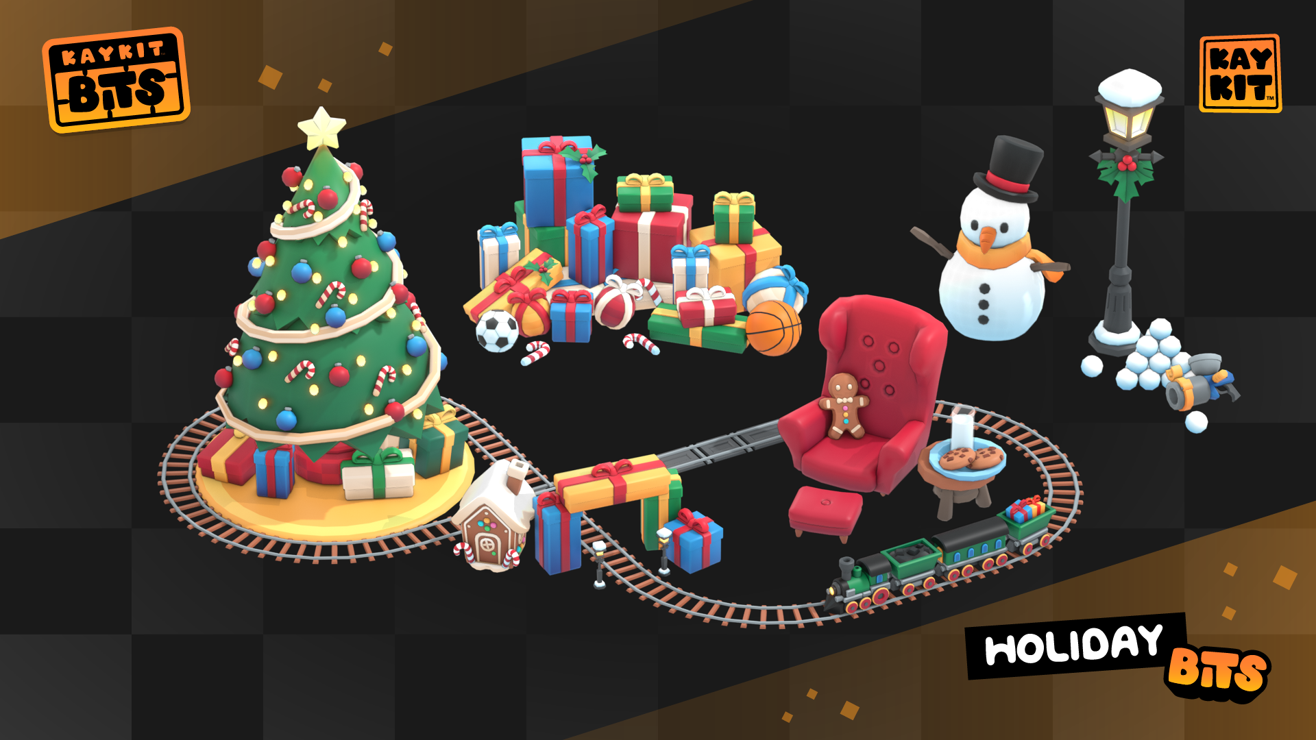This pack has a bunch of holiday themed 3D models, great for adding some festive flair to your game, or make a small seasonal game. There's presents, a christmas tree, train and traintracks, festive cookies and snacks, snowman, snowballs, snowball cannon, modular gingerbread pieces, and much more!
